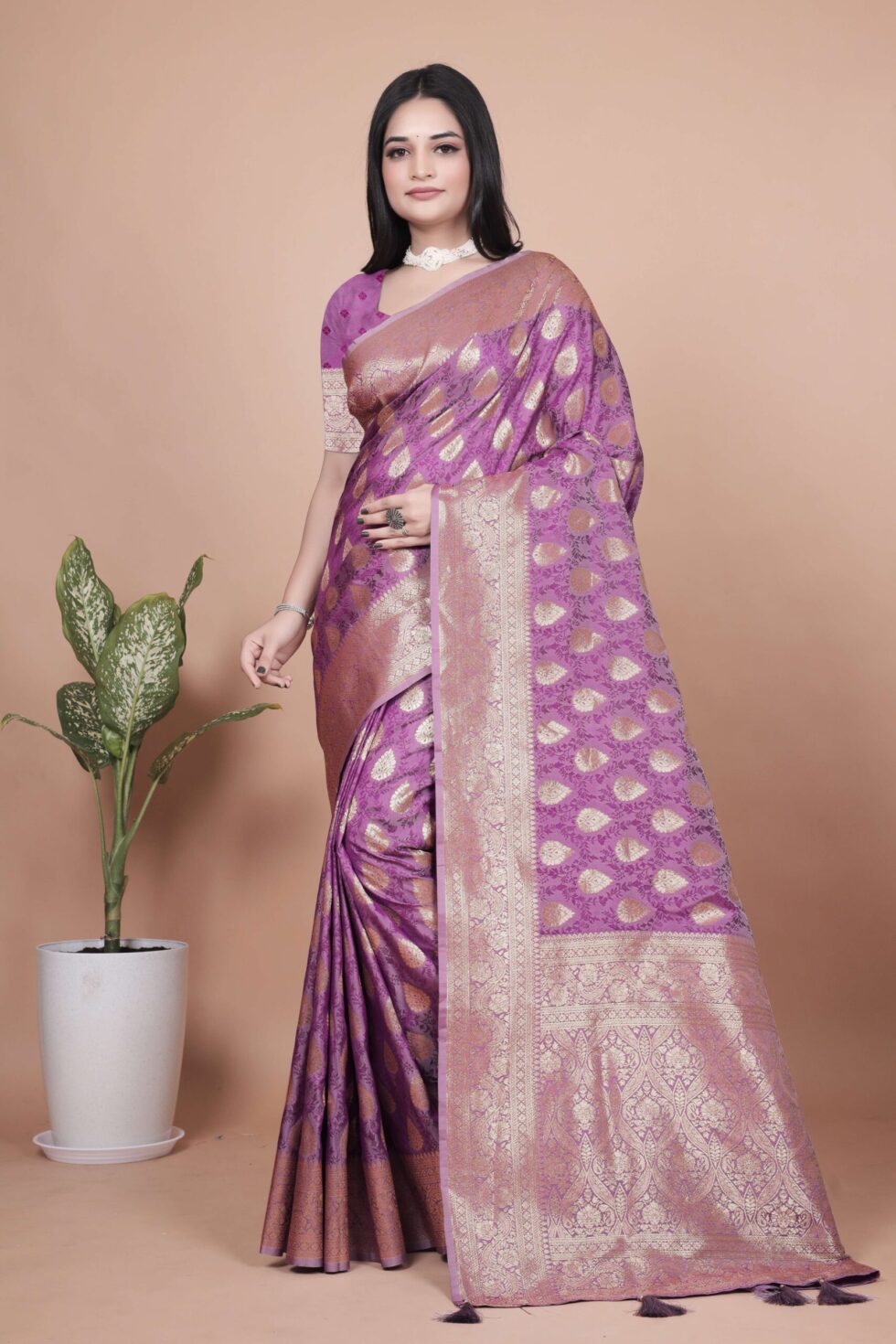 Step into timeless elegance with this Banarasi Silk Saree, thoughtfully crafted to celebrate the richness of Indian tradition. Made from premium Banarasi silk, the saree features intricate golden zari weaving highlighted with classic teardrop and floral butta motifs, reflecting heritage craftsmanship and refined design.