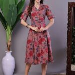 Women’s Pink Floral Cotton Pleated Midi Dress with Collar