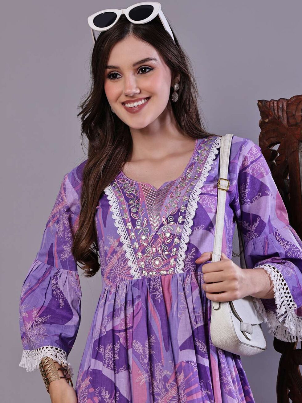 Wome’s Purple Floral Cotton A-Line Dress with Lace Detailing Midi Dresses